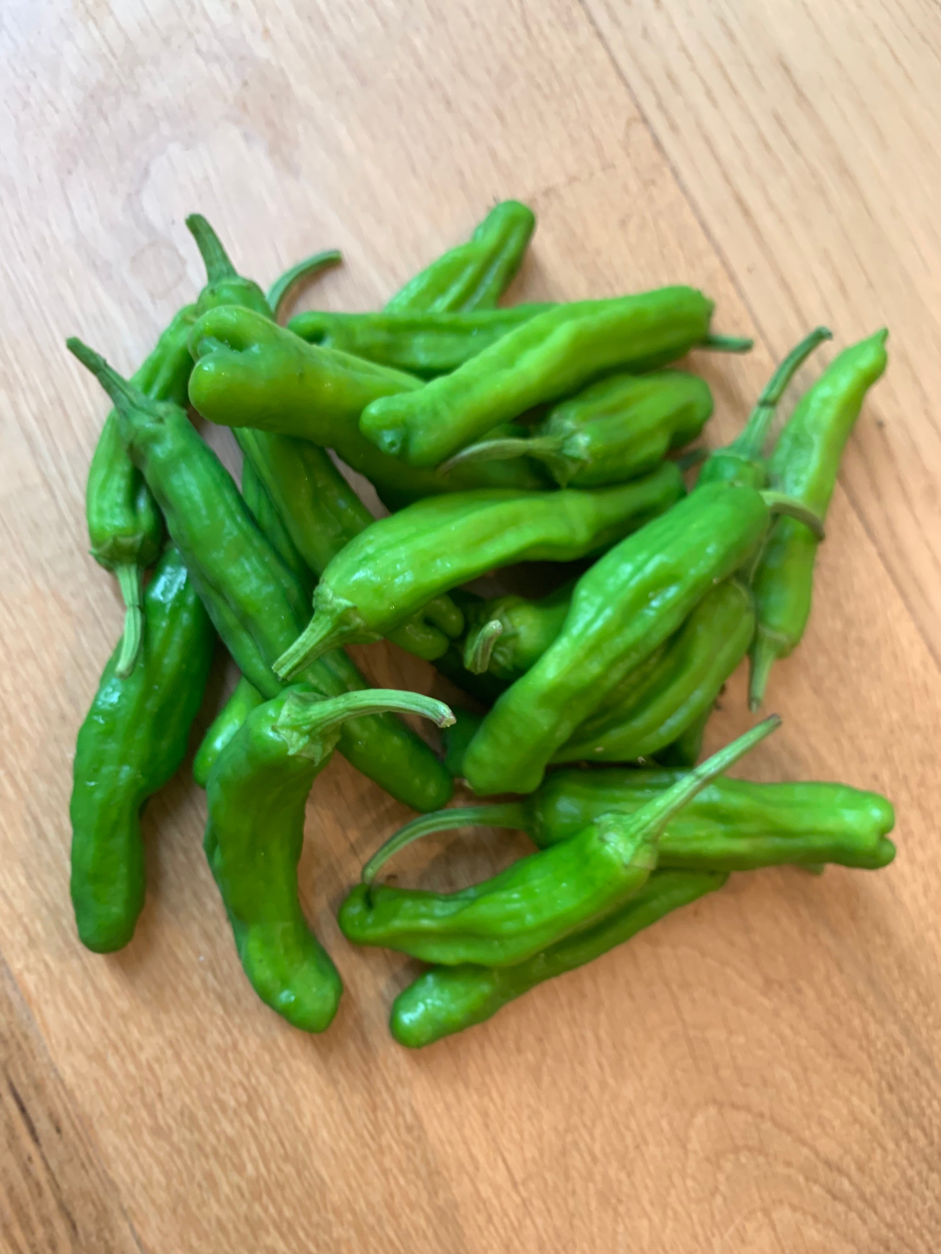 A small, East Asian pepper, bright green and usually mild… except for about 1 in 10 that has a spicy kick! Delicious roasted, on the bbq, or deep fried. Often served as bar snacks.